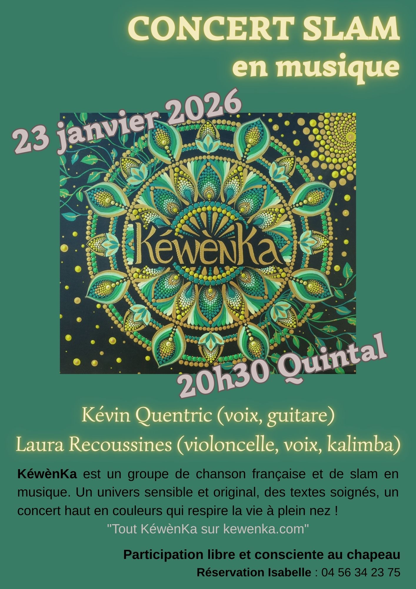 Concert favorisant nos échanges « comme à la maison, mais ensemble ! », entre slams et chansons, pour partager de façon qualitative et spontanée dans la continuité des thèmes abordés pendant le concert (amour, liberté, nature, spiritualité, légende personnelle, stratégies intérieures face aux enjeux sociétaux,…).